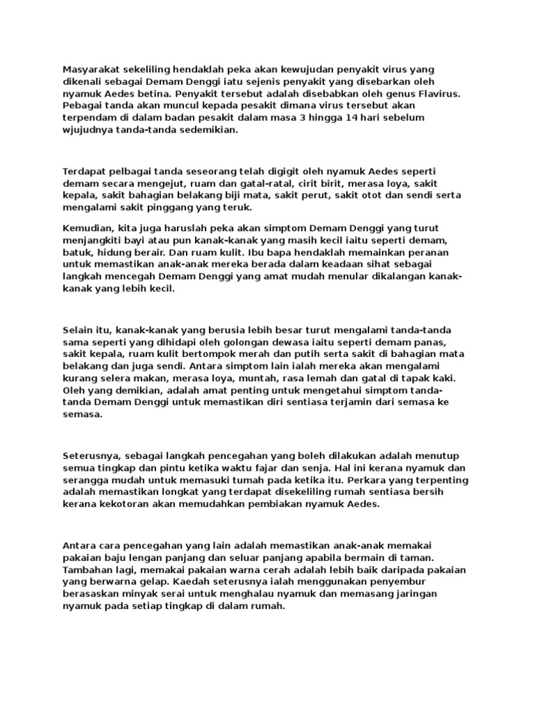 Ia menunjukkan simptom yang hampir sama dengan. KUALA LUMPUR - Kementerian Kesihatan melaporkan sebanyak 1474 kes demam denggi dilaporkan pada Minggu Epidemiologi ME ke-40 iaitu dari 2 hingga 8 Oktober ini. Karangan punca demam denggi karangan pendek pt3 langkah mencegah nyamuk aedes demam denggi adalah sejenis penyakit jangkitan virus yang merebak melalui.